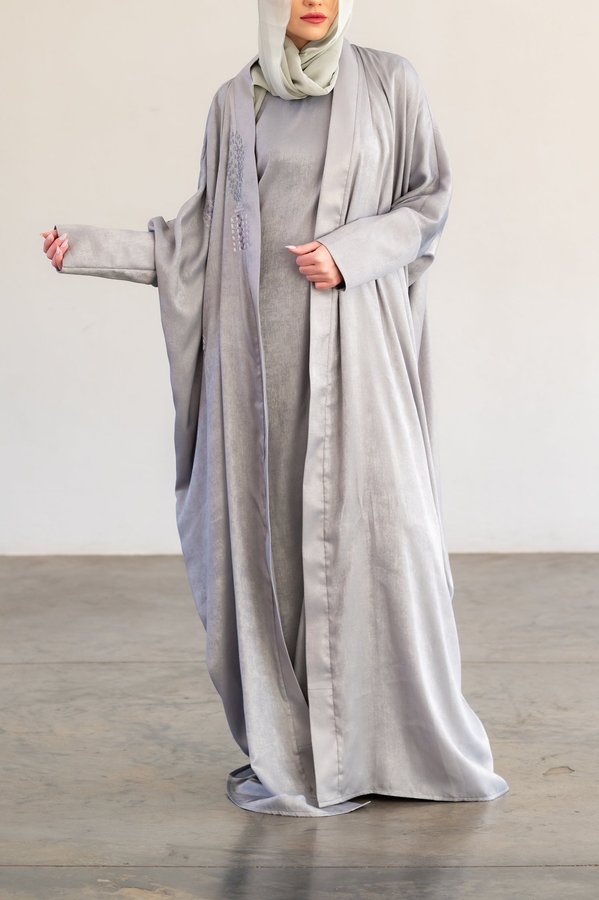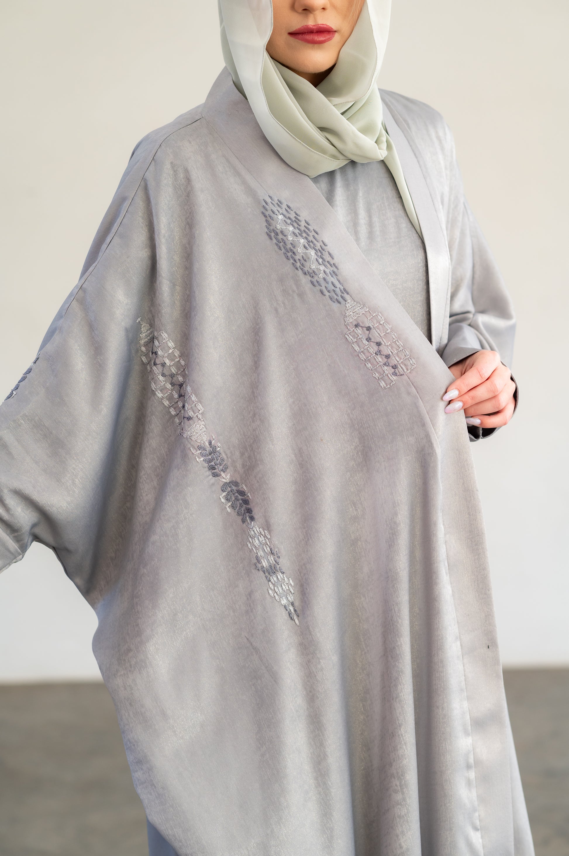 Grey abaya with hand embroidered details. (Inner not included. Can be purchased separately)